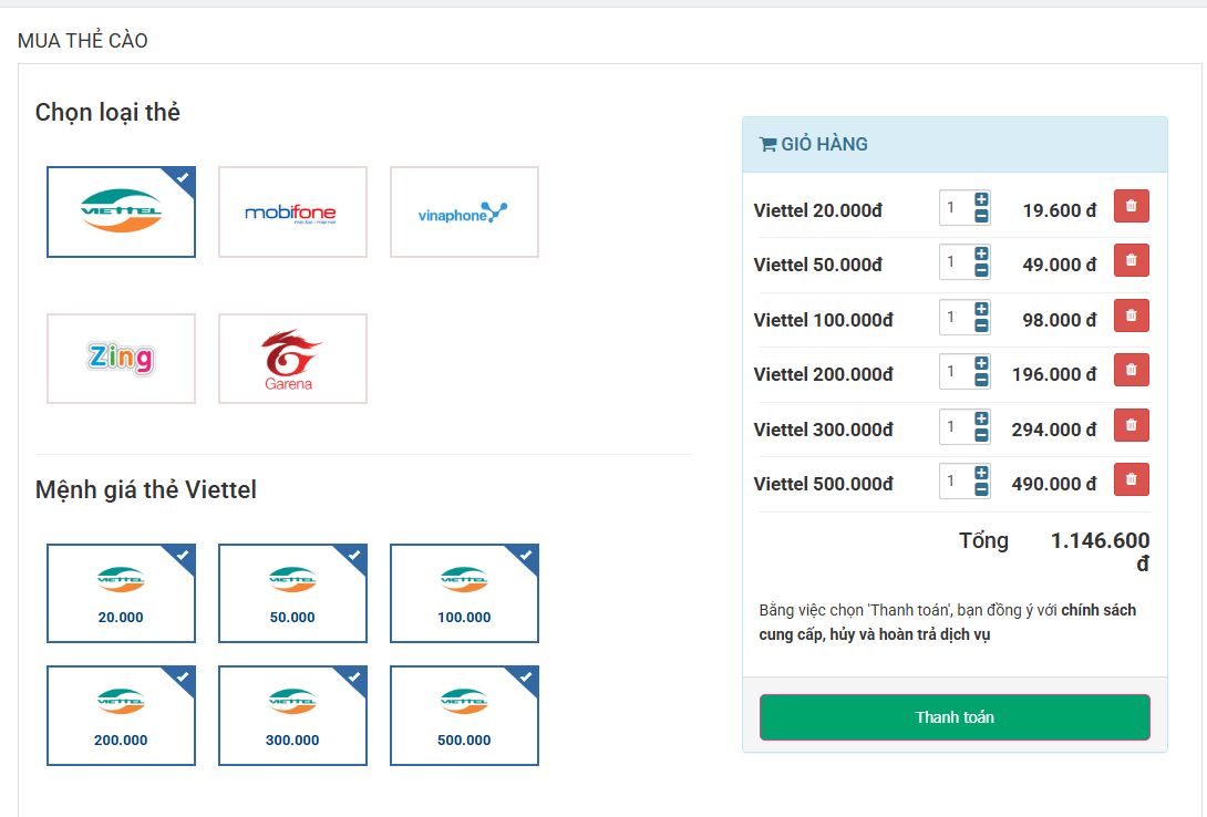 Sau khi xác nhận thông tin chính xác, hệ thống sẽ xử lý đổi thẻ cào thành tiền lưu lại trong hệ thống website. Bạn sẽ dùng số dư đó để mua thẻ viettel nhanh chóng.